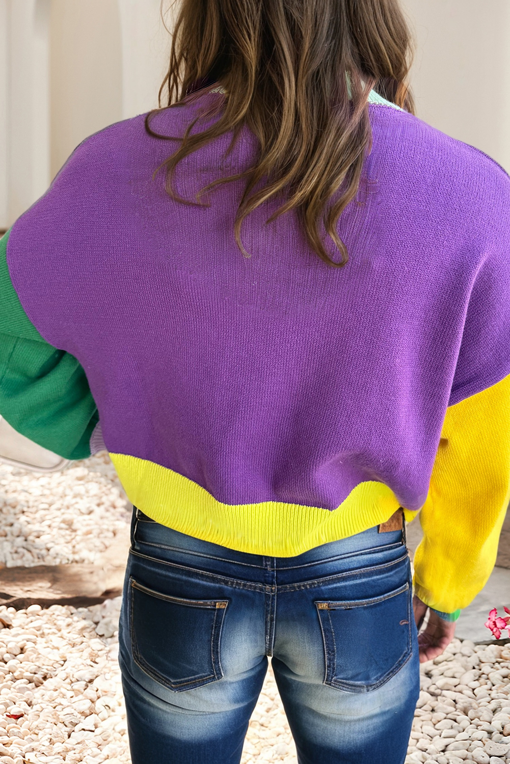 🎨 Colorblock patchwork brings bold Mardi Gras style! 🎭 Fun graphic makes a festive eye-catching statement! 🧥 Relaxed fit + ribbed trim = perfect structured look! 🥳 Ideal sweater for parades, parties & holiday vibes! 🛍️