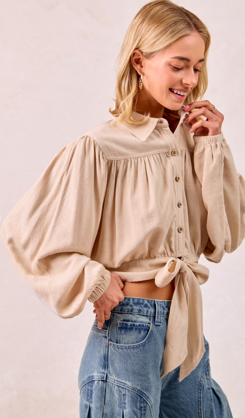 OATMEAL LINEN VISCOSE TIE HEM DETAIL CROP BLOUSE
