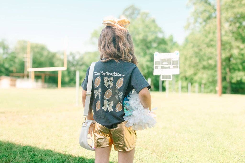 Football is full of traditions, and we're tied to them with a pretty bow! Design features a charcoal-colored tee with black and gold accents and showcases coquette bows and footballs. This is a back design with a matching specialty left chest logo on the front.